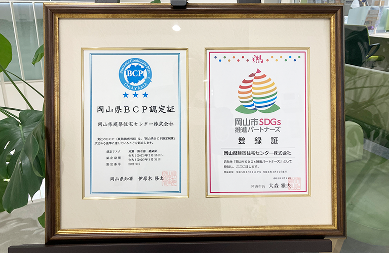 また、大規模災害、感染症、サイバー攻撃等、不測の事態が発生した場合でも、審査・検査業務が早急に再開できるように事業継続計画(BCP)を作成し、2023年2月に「令和4年度岡山県BCP認定事業者(★★★)」の認定を受けました。一方、岡山市内で経済・社会・環境の調和した持続可能な社会を目指す事業者を登録する「岡山市SDGs推進パートナーズ」第1期事業者登録を同年3月に受けました。