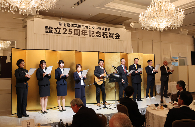 お陰様で設立25周年を迎え、記念ソングを社長と社員がアイディアを出し合って作りました。「これまでも、これからも、岡山の人々のふるさとをつくる」の決意を歌にこめて歌いました。