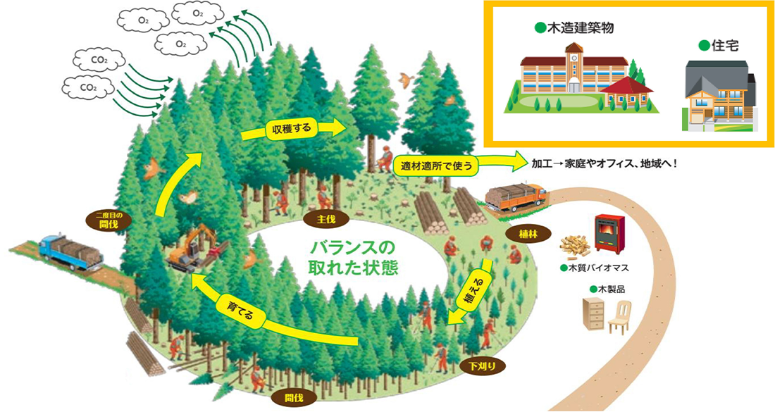 地球温暖化防止のためにはCO2の排出を抑えるだけでなく、CO2を吸収してくれる森林を整備・保全しながら循環利用する「森林の持続可能な経営」が不可欠です。また、木材需要の約4割を占める建築物分野での木材利用、具体的には住宅だけでなく、非住宅建築物や中高層建築物の木造化・木質化は脱炭素社会の実現に大きく貢献します。