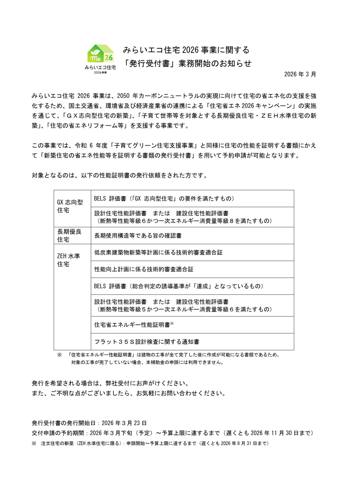 みらいエコ住宅2026事業に関する「発行受付書」業務開始のお知らせ