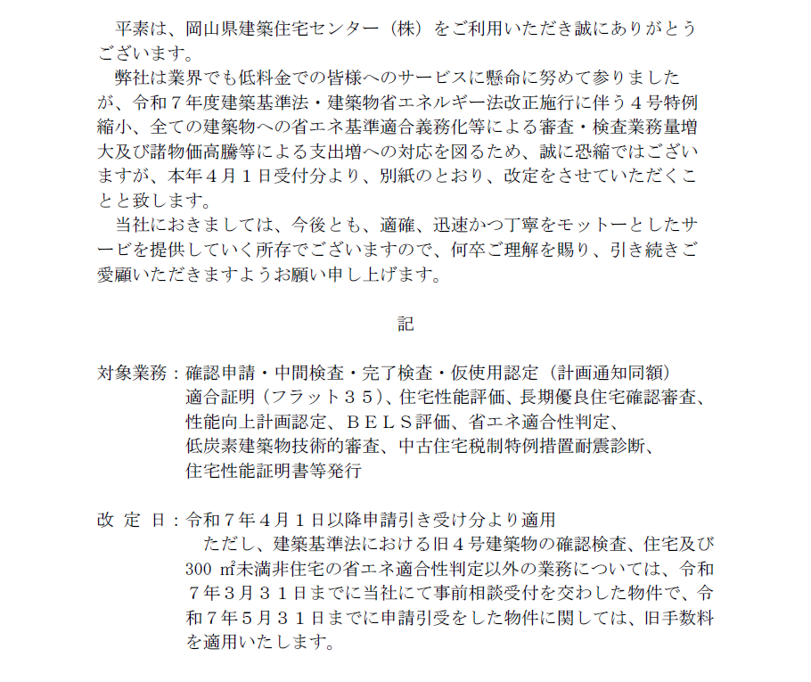 新着情報 TOP > お知らせ > 令和7年4月1日以降受付分の建築確認検査業務等手数料の改定のお知らせ 令和7年4月1日以降受付分の建築確認検査業務等手数料の改定のお知らせ お知らせ 投稿日:2025/03/17 改定手数料につきましてはこちらをご覧ください。 新二・三号建築物の基礎鉄筋の緊結方法について 令和7年度建築基準法・建築物省エネルギー法改正施行に係るチェックシートについてのお知らせ お知らせの一覧へ戻る